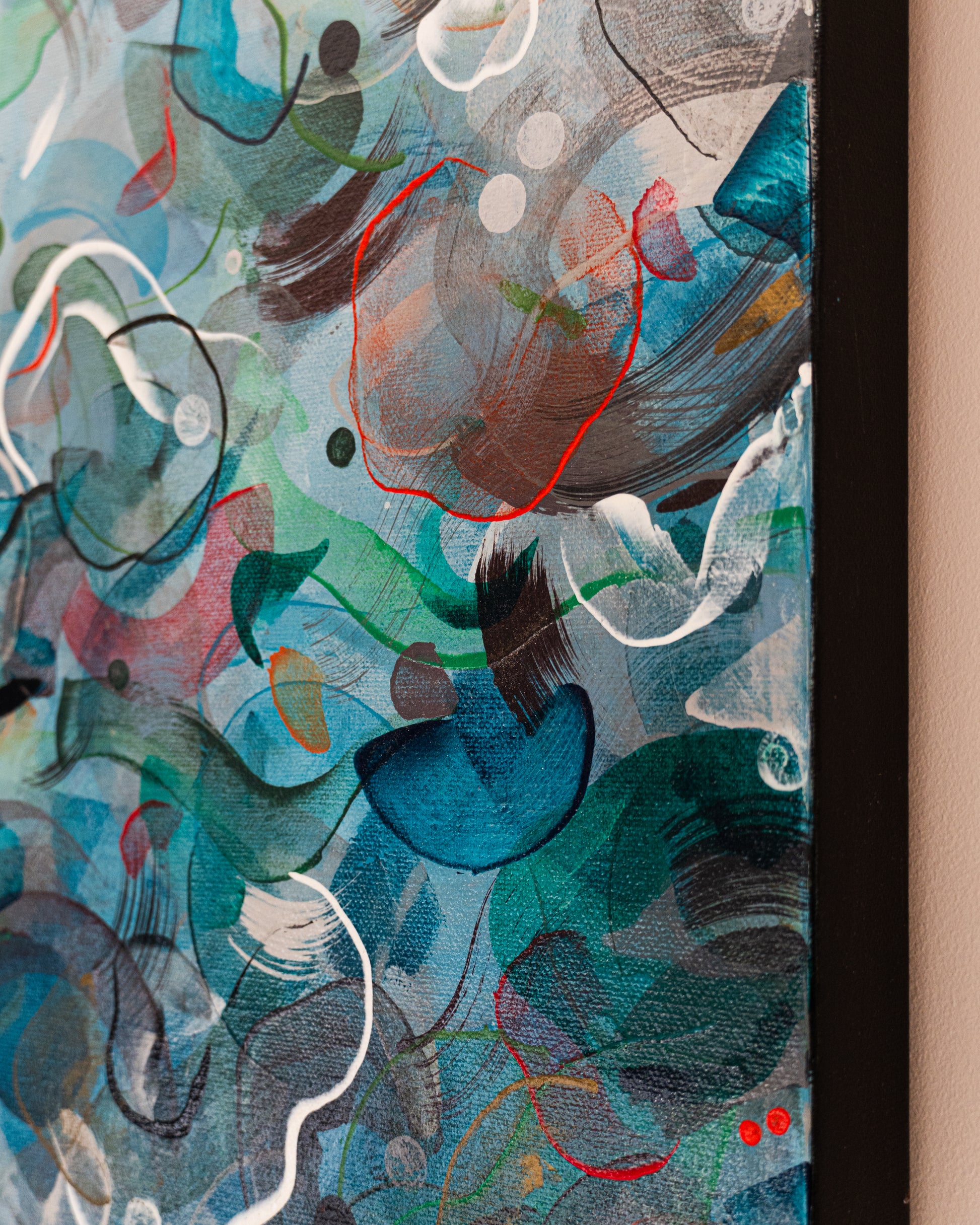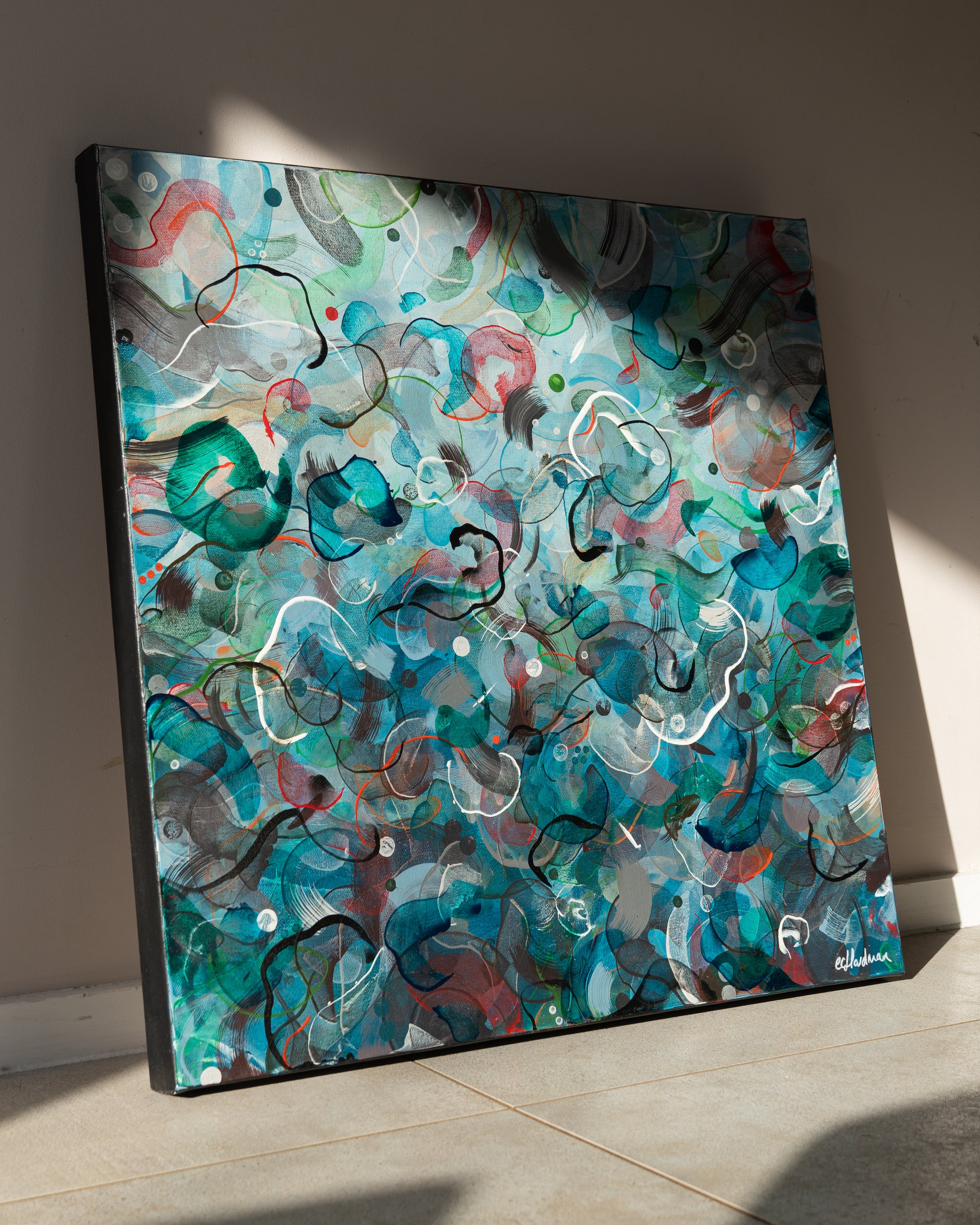Immerse yourself in the dynamic energy of "Tangled in Motion" – a captivating abstract masterpiece that brings movement and vitality to any space. This original artwork showcases a mesmerizing dance of organic forms and flowing lines that seem to pulse with life across the canvas.