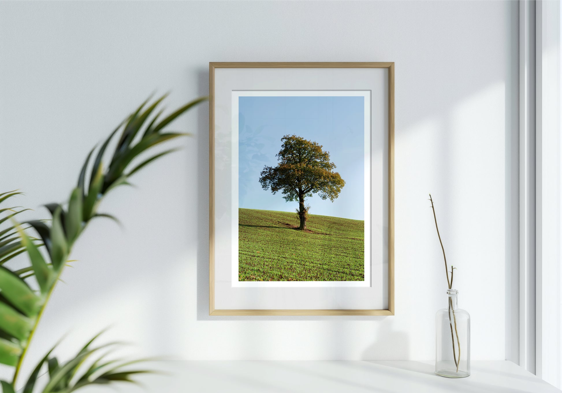 Bathed in soft morning light, The Lonely Tree stands quietly against the rolling hills of the English countryside. Its solitary form captures both strength and serenity — a reminder of resilience, simplicity, and the quiet beauty found in still moments. The vivid greens and clear blue sky evoke a sense of calm and open space, making it a timeless piece for those who find peace in nature’s solitude.